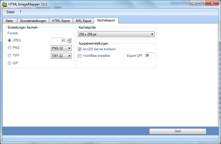 Diese Eingabemaske stellt zum Export von Bildkacheln zusätzliche Optionen bereit. Diese Funktionen können auch unabhängig von der Erstellung eines HTML-Projektes durchgeführt werden. (siehe Einstellung auf dem Reiter “Ausgabe“ im Kasten „Ausgabe“, Ausgabe)