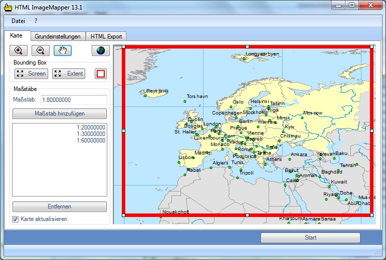 Sollten Ihnen die Voreinstellungen „Screen“ und „Extend“ nicht genügen können Sie in der Übersichtskarte die rote Bounding Box anpassen. Diese Bounding Box zeigt das Gebiet an, welches in ein HTML ImageMapper 13.1 Projekt prozessiert wird.