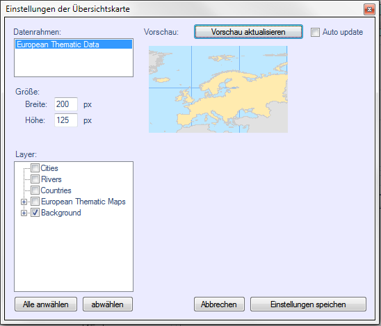 Die Größe der Übersichtskarte können Sie über die Eingabeboxen „Breite“ und „Höhe“ anpassen, wobei das Seitenverhältnis automatisch beibehalten wird. In der Liste „Layer“ sind die Ebenen zu selektieren, welche in der Übersichtskarte angezeigt werden sollen. Bei sehr vielen Layern ist es oft einfacher, alle Checkboxen zu deaktivieren und dann die wenigen auszuwählen, die tatsächlich bei einem so kleinen Maßstab sinnvoll sind. Als Maßstab wird der niedrigste festgelegte Maßstab verwendet.