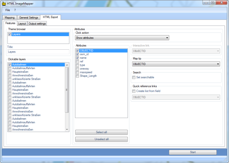 In the theme browser, the data frames of the ArcGIS project are at your disposition. If several data frames are chosen, an HTML ImageMapper 13.3 project is created, in which various thematic maps can be displayed.