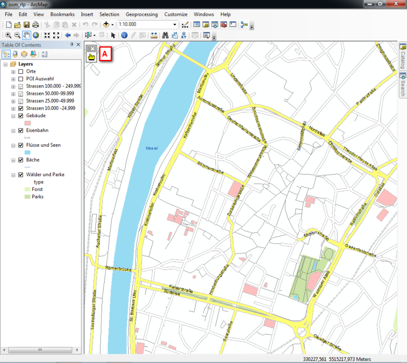 After the successful installation you load or create your map in ArcGIS as usual. Now you start the “HTML ImageMapper 13.3” extension by clicking the yellow hand (A). If you can’t find the hand, follow the instructions in chapter “Loading in ArcMap”.