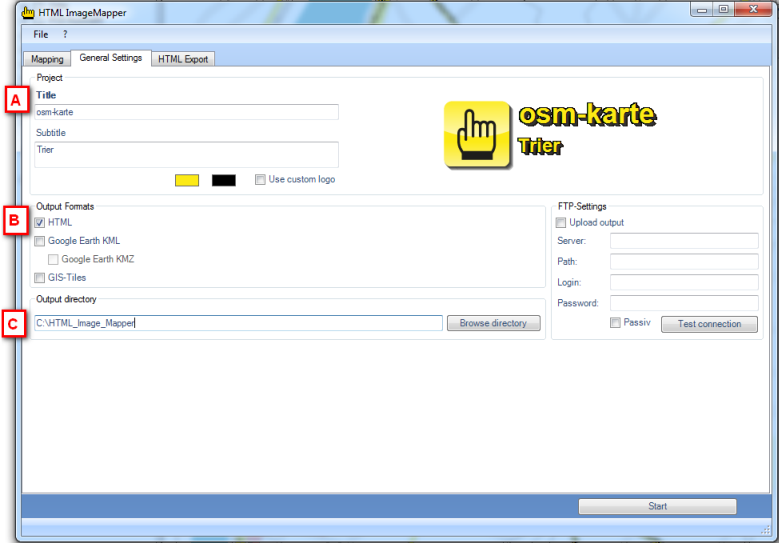 The General Settings are next. Enter the map title and if required the subtitle (A). Choose HTML as the output format (B). In the last step you just have to specify where you want to save your project (C).