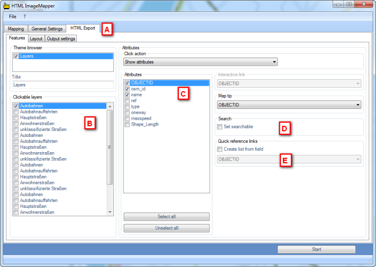 Continue by clicking the Features tab on the HTML Export tab (A). Here you will assign an action to layers and their objects respectively, which is carried out by clicking them. First select from "Clickable layers" (B) the one you wish. Leave the click-function on “Show attributes” and choose under “Attributes” (C) the ones to be displayed when clicking on the object. If you select "Set searchable” (D), your online map can be searched for attributes of the chosen layer. Additionally you can have a link list created (E) from which you can later choose your desired feature