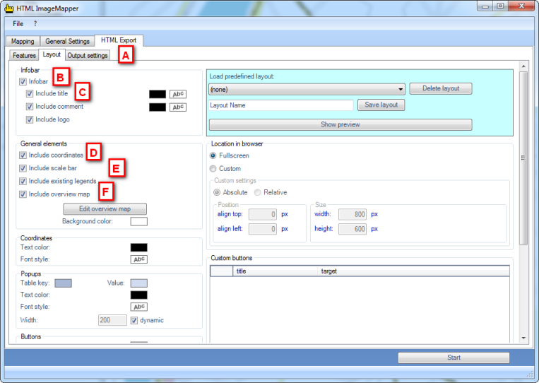 Activate "Infobar” (B) and “Include title” (C) in order to entitle your map. To add more elements to the map, click "Include coordinates" (D) as well as “include scale bar” (E) to show them.