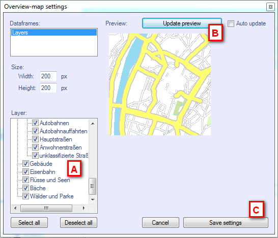 Choose the layers you want to use for the overview map (A). Click on “refresh preview” (B) to take a look at the result. If your are satisfied with the result you can confirm and click on “save settings” (C).
