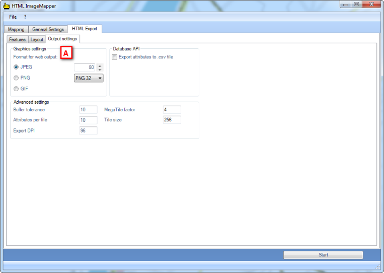 In the tab „output“ you can choose the format of the output tiles if required (A). At first do not change the default settings.