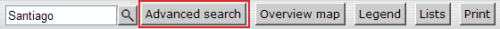 The professional search is accessed with a button in the navigation bar below the map. It is also carried out over all searchable layers. However, the search can be considerably limited.