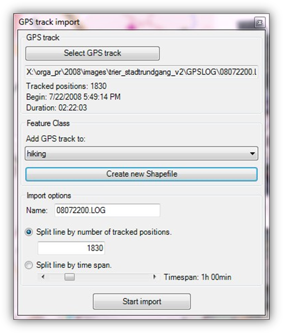 This tool offers the possibility to import GPS logs in different formats and transfer them into a line feature. You can determine the geometry and attributes of this line feature with several settings.