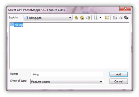 In GPS PhotoMapper 2.0 feature classes were saved in a Personal Geodatabase. So first select the database file (*.mdb) from the file dialog and then the feature class.