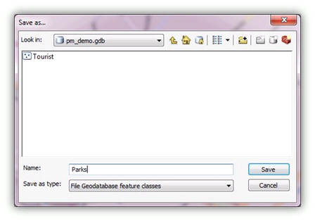 Then select the File-Based Geodatabase where you would like to save the imported feature class and enter a name for it.