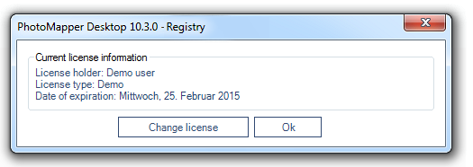 After purchasing a commercial license, you can convert the software to the full version with all functions without a new installation. As soon as you start ArcMap with a PhotoMapper Desktop 10.3 demo version, the following window opens: