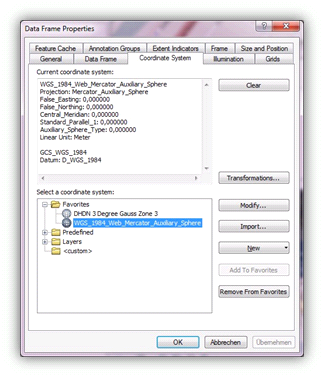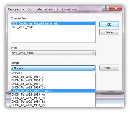 If the ellipsoid/datum of a layer differs from the ellipsoid/datum of the data frame, however, a so-called datum transformation has to be carried out. ArcMap cannot decide autonomously which datum transformation is to be used. This is where you, the user, have to take action.