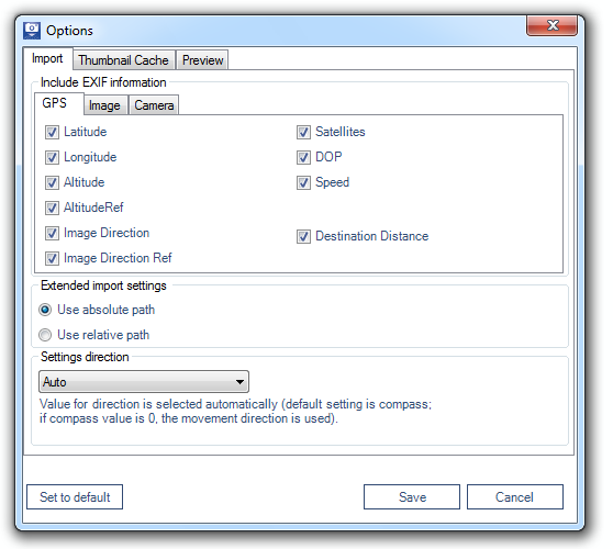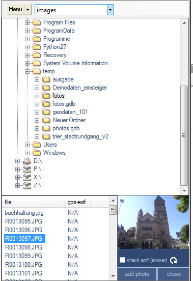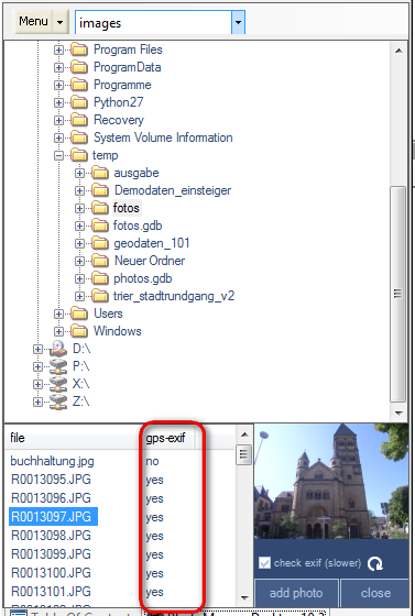 If you want to display whether or not the photos listed in the overview are georeferenced, click on the "Evaluate EXIF" selection box (for directories which have already been loaded, click on the “Refresh” button. Now, when accessing a directory, the EXIF headers of the photos will be searched for GPS coordinates and the result is displayed in the "GPS-EXIF" column of the picture list.